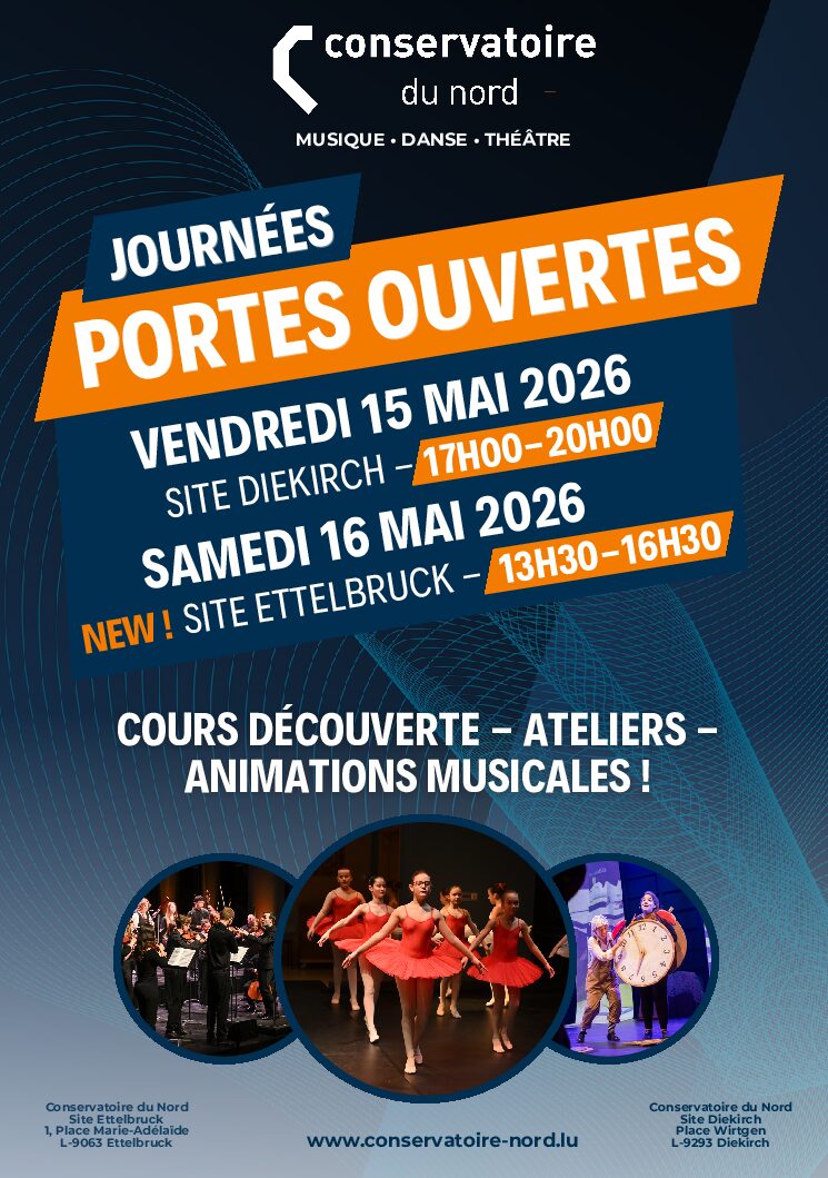 Que vous soyez passionnés de musique, curieux ou simplement à la recherche d’un moment culturel en famille, cette journée est faite pour vous ! Restauration, boissons et friandises seront proposées durant l’après-midi. Retrouvez toutes les informations pratiques, horaires détaillés et programmes complets des Journées Portes Ouvertes 2026 de Diekirch et Ettelbruck sur le site web du Conservatoire : www.conservatoire-nord.lu
