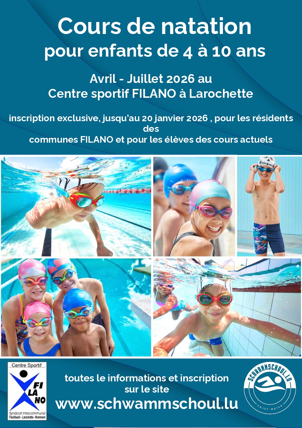 Vun Abrëll bis Juli 2026 ginn an der Schwämm Filano an der Fiels Schwammcourse fir Kanner tëschent 4 a 10 Joer organiséiert.