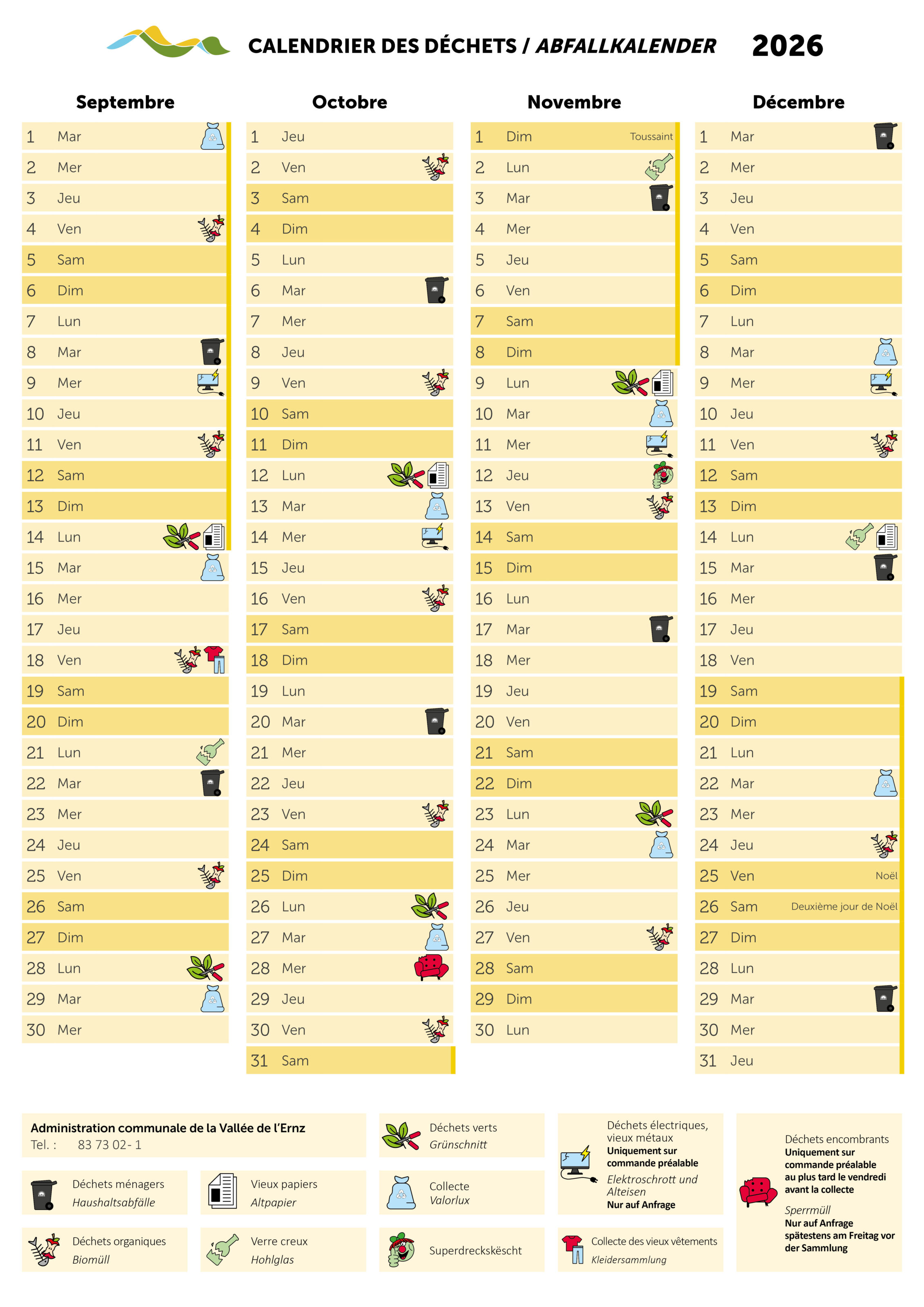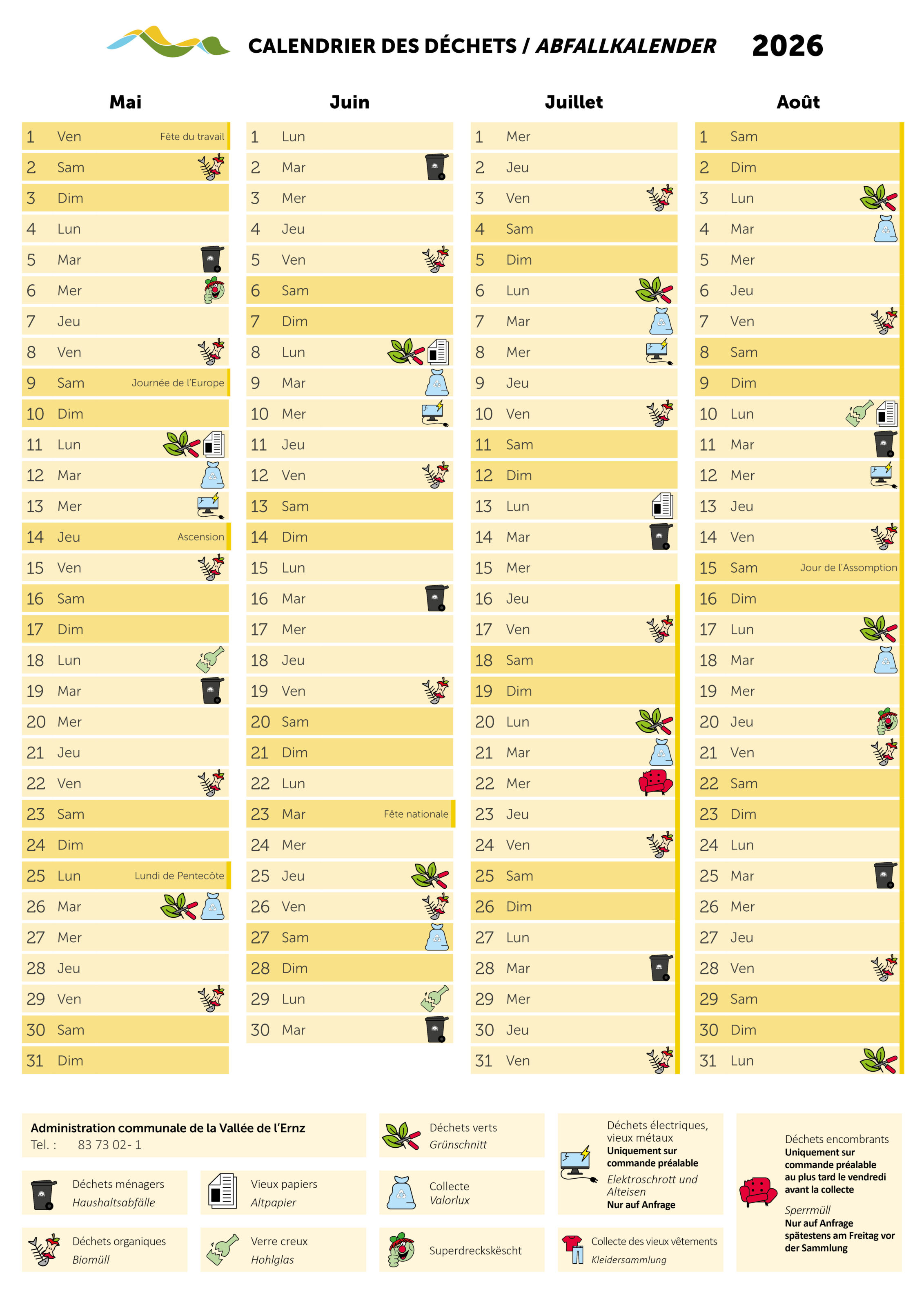 Chaque ménage doit avoir une poubelle « grise ». La collecte des déchets ménagers est assurée toutes les deux semaines. Veuillez consulter le calendrier des déchets pour les dates exactes.